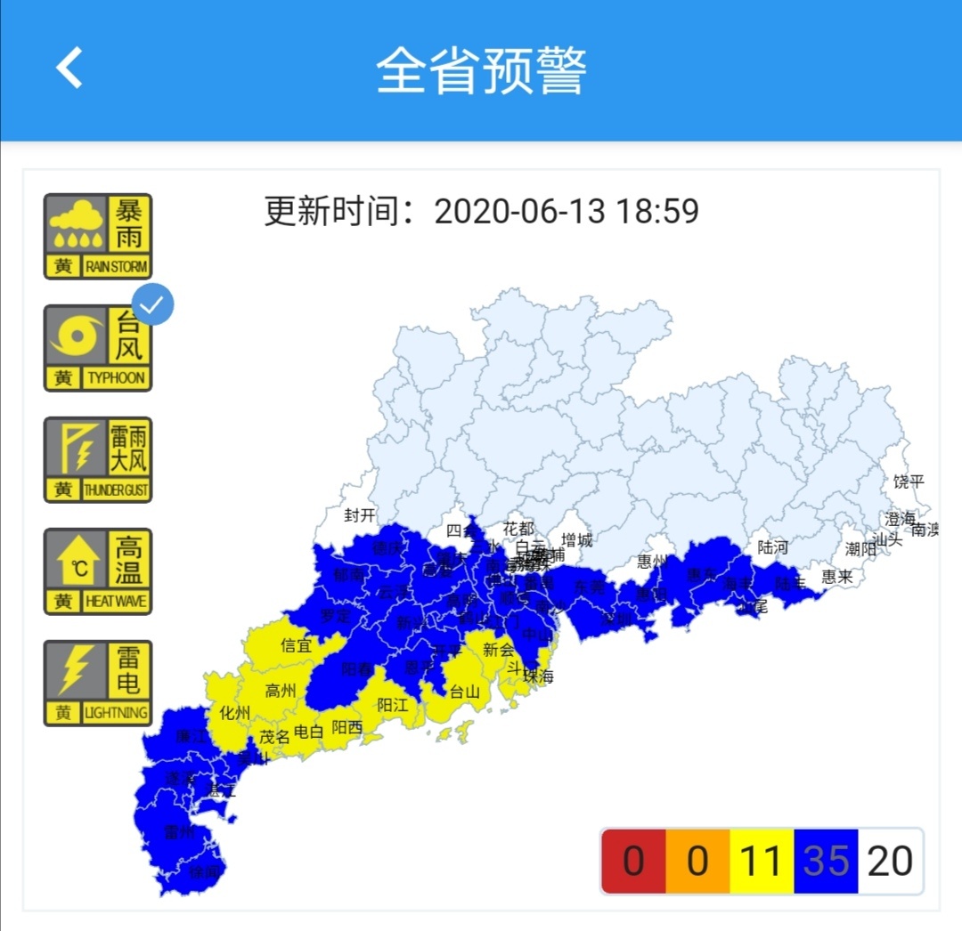随着台风靠近,广东风雨逐渐明显,“鹦鹉”将于14日白天以热带风暴级或强热带风暴级(最大风力9-10级)在珠海到湛江一带沿海登陆。截至19时,全省中南部市县基本启动台风预警信号。