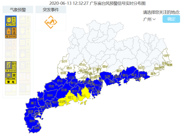 随着台风靠近,目前已有部分水汽甩上广东,珠海、惠州等地出现分散降雨。截至12时30分,广东中南部地市已发布48条台风预警,其中阳江阳西县、江门台山市发布台风黄色预警。