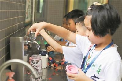 “我们一年级啦!”“欢迎新同学!”在广东实验中学荔湾学校第二小学部(简称“省实荔湾二小”)8月27日的新生报到日上,黑板上写着热情的欢迎词,迎接“小萌新”。该校校园环境中处处体现幼小衔接理念,比如贴合孩子身高的“大象”洗手池,有着攀爬架、平衡桥、滑梯等运动游玩设施的“欢乐岛”,老师带着同学打卡校园,每到一处都响起欢声笑语。