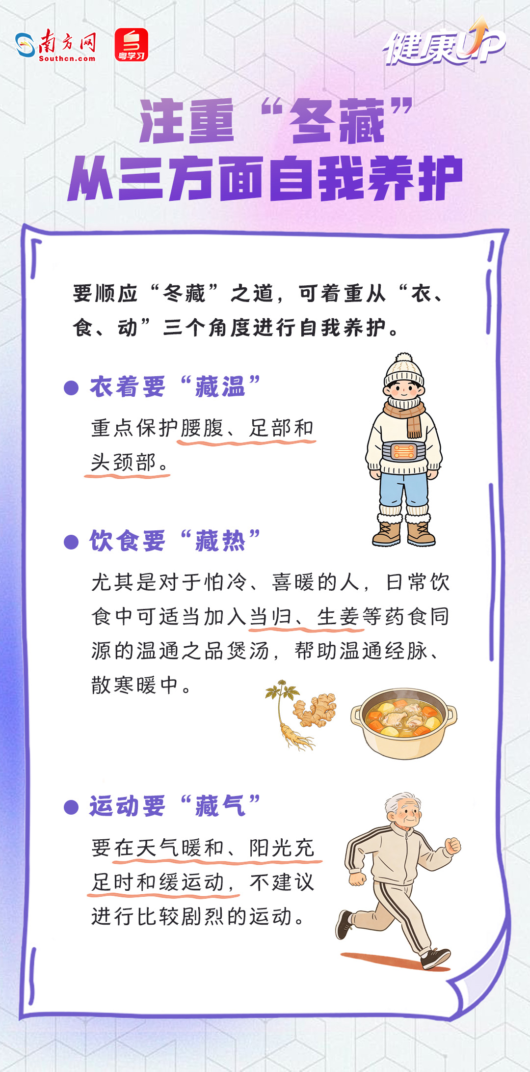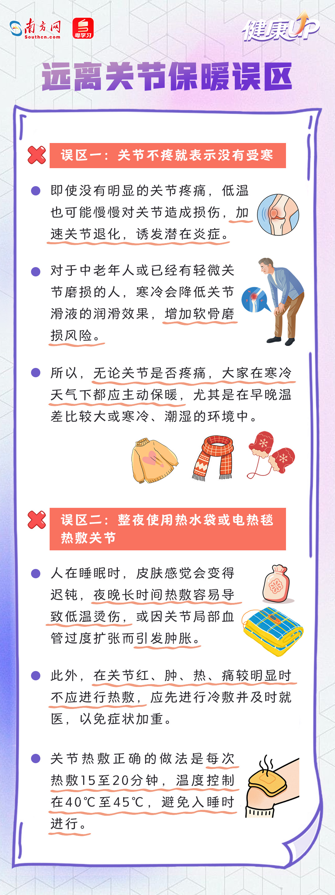 今天(1月20日)是大寒,民间常说“小寒大寒,冻成一团”。据广东省气象台消息,20日至23日较强冷空气将给广东带来明显降温和大风。寒冷天,很多人会感觉寒气往骨头缝里钻,“老寒腿”症状有所加重,感到膝盖发僵、肩膀酸痛,或者走路时脚踝隐隐作痛。据专家介绍,应对关节这种“冷痛”,关键在于“温通”,具体可从生活调护和中医外治两方面入手,一组海报带你了解→