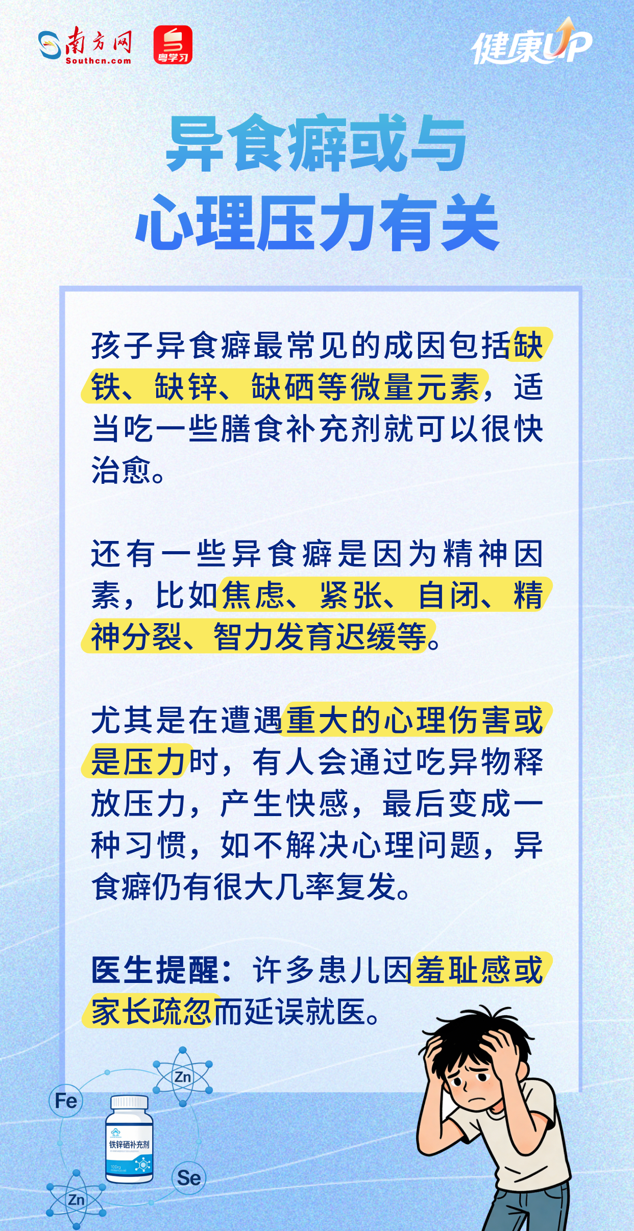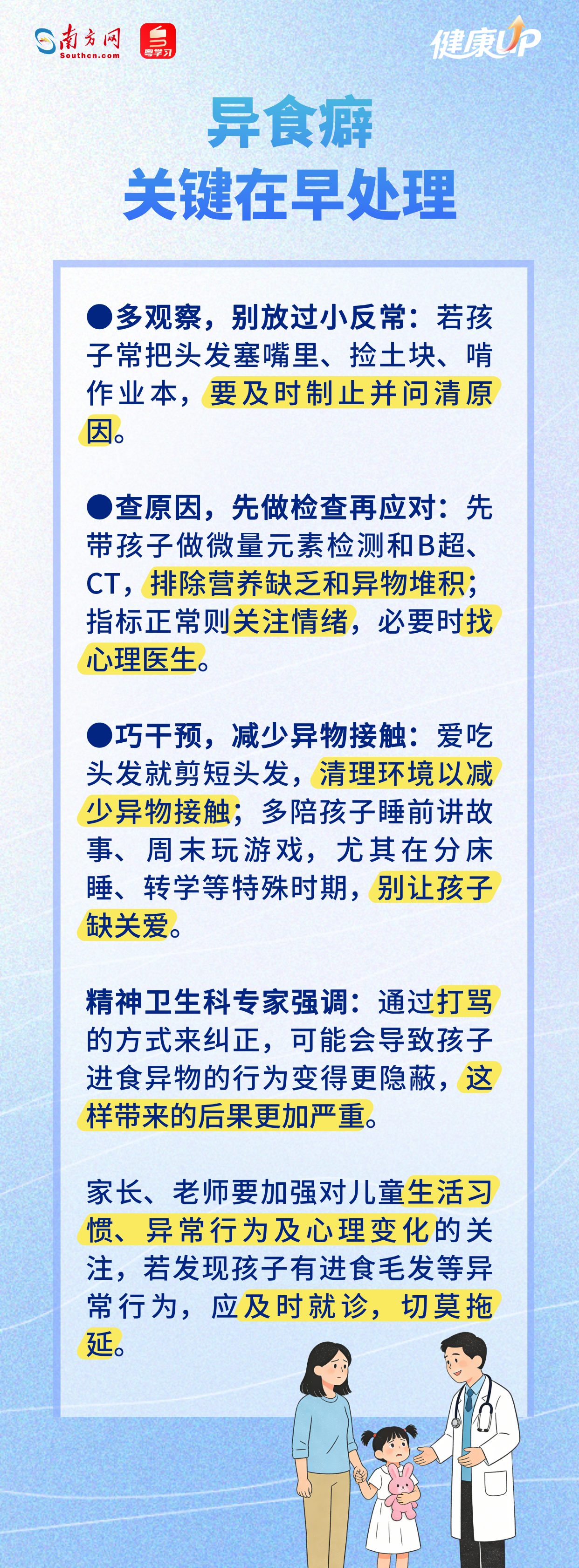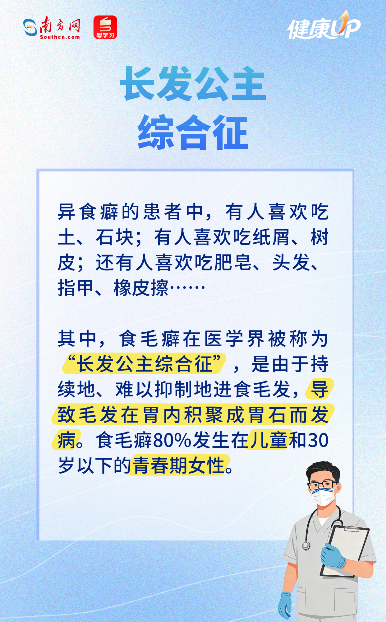 “佳佳这种吃头发的行为在临床上属于‘异食癖’。这类患者经常吃一些非食物性的东西,比如纸、陶土、泥土等,通常这些东西不会对身体造成直接的伤害,但是可能会导致像肠梗阻、便秘、寄生虫感染等并发症。”浙大一院精神卫生科吕海龙副主任医师表示。