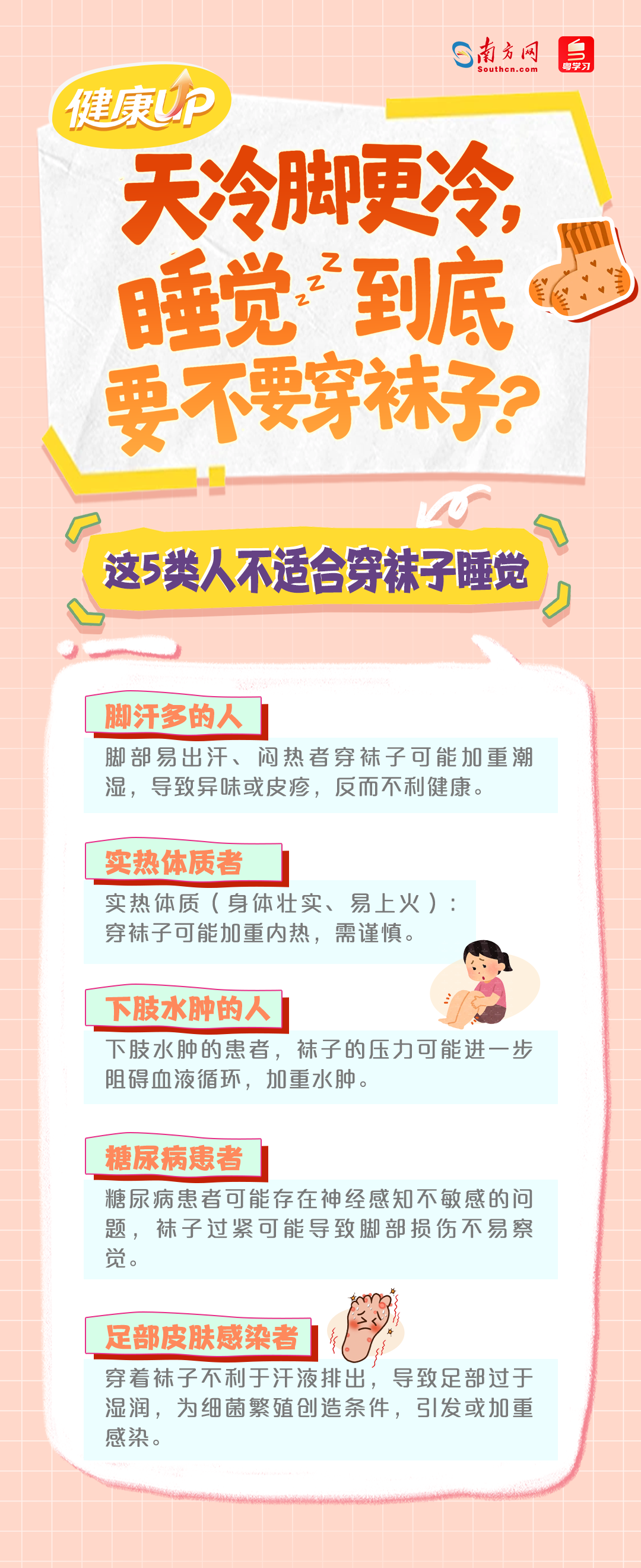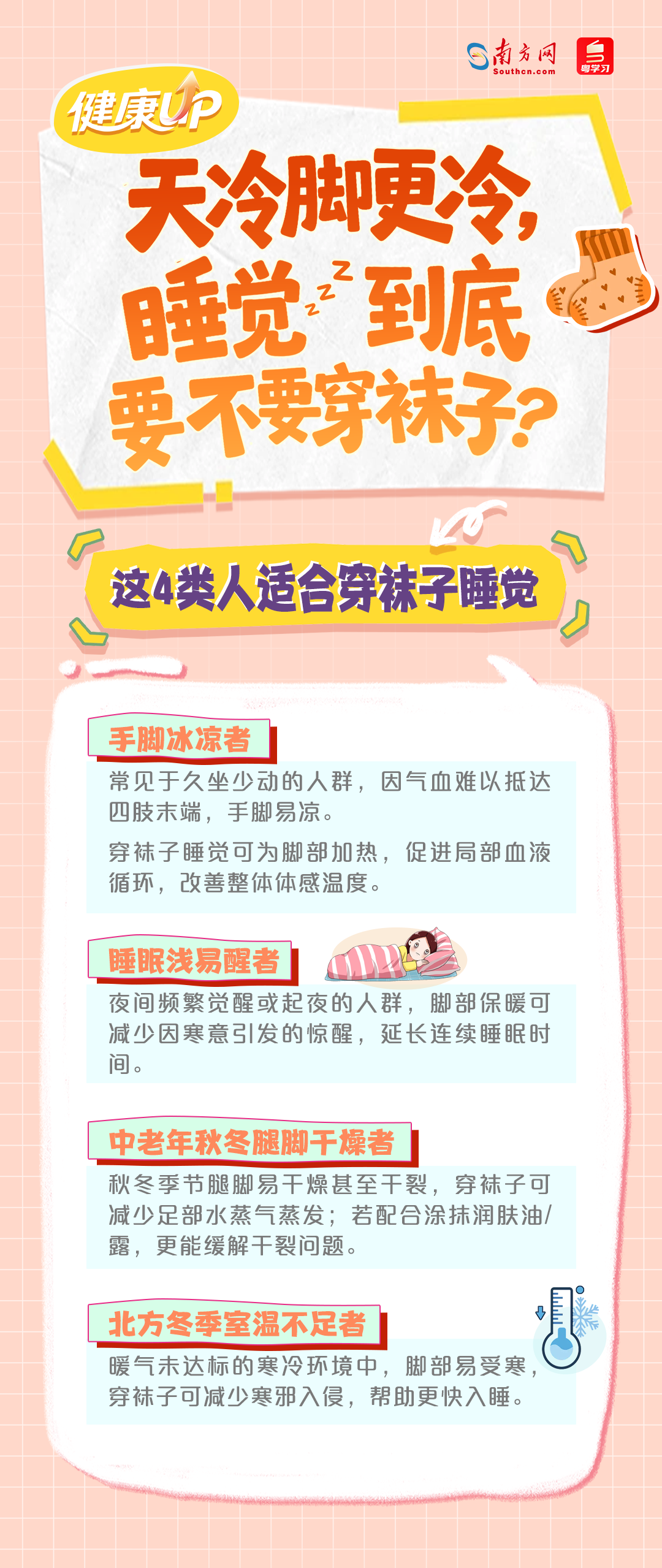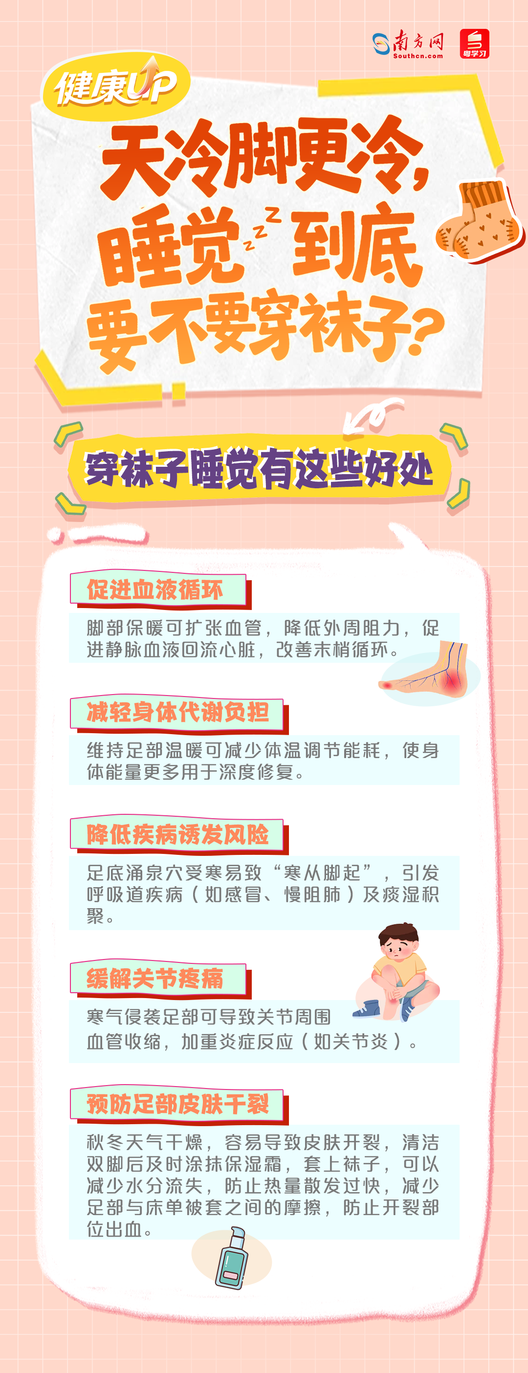 据广东气象部门消息,新一股中等偏强冷空气将于12日夜间入粤,本周末将迎降温、降雨双重夹击,开启“湿冷模式”,降温5℃—8℃。寒冷天气,你会不会也这样:脚冷得像冰块,盖着被子也捂不热;翻来覆去睡不着,半夜总醒……中医认为:脚为“精气之根”,脚暖了气血才能顺,睡觉才香!试试穿袜子睡觉,改善睡眠、养护脏腑。穿袜子睡觉有哪些好处?哪些人适合穿袜子睡觉?一起来看看。