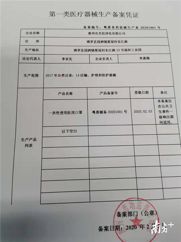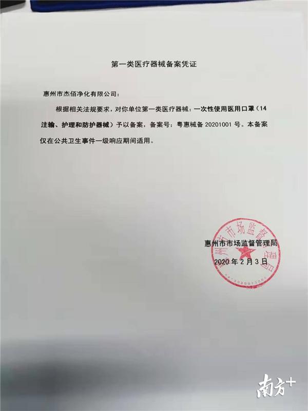 面对新型冠状病毒感染的肺炎疫情,惠州市市场监管局在收到惠州市杰佰净化有限公司相关备案申请后,特事特办,快速为该企业办理第一类医疗器械生产备案,并于2月3日向该企业发出生产“一次性使用医用口罩”备案凭证,积极保障公共卫生事件一级响应期间应急防护用品的需要。
