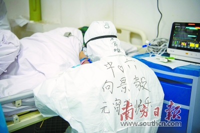 广东支援武汉医疗队员在防护服上写着“元宵节快乐”。南方日报特派记者 徐昊 摄