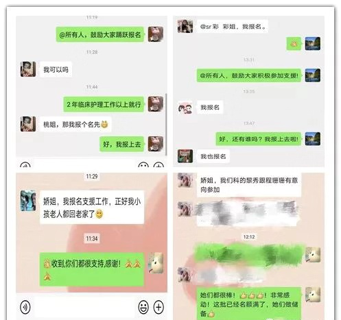 “我报名”、“我也报名”、“我报名支援工作,正好我小孩老人都回老家了”、“我报名,什么时候需要我,我什么时候上,时刻准备着”。1月28日,南区医院接到市卫健局关于增派第五批护理人员参与医疗救治工作的通知,需抽调两名有2年以上工作经验的护士前往市第二人民医院支援抗击疫情。报名信息在医院群里一发出,不到一小时,各科室数十名护理人员纷纷请缨出征前线作战。