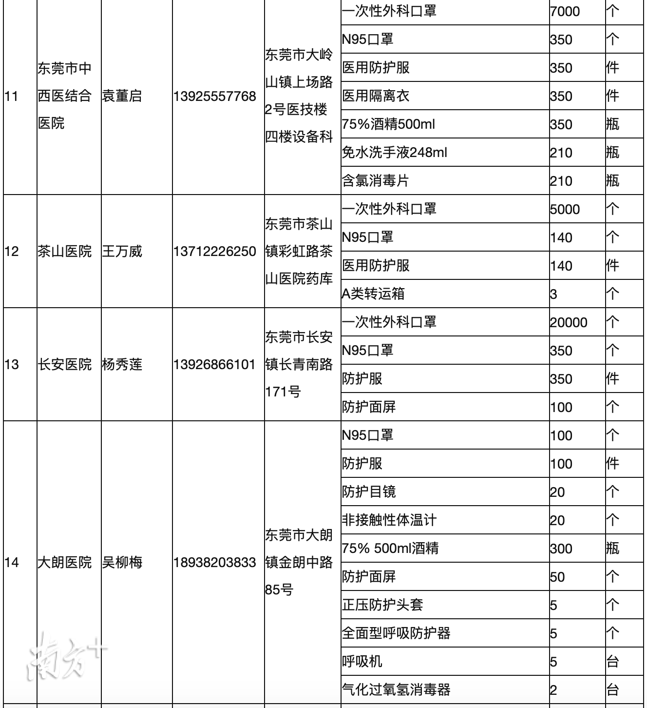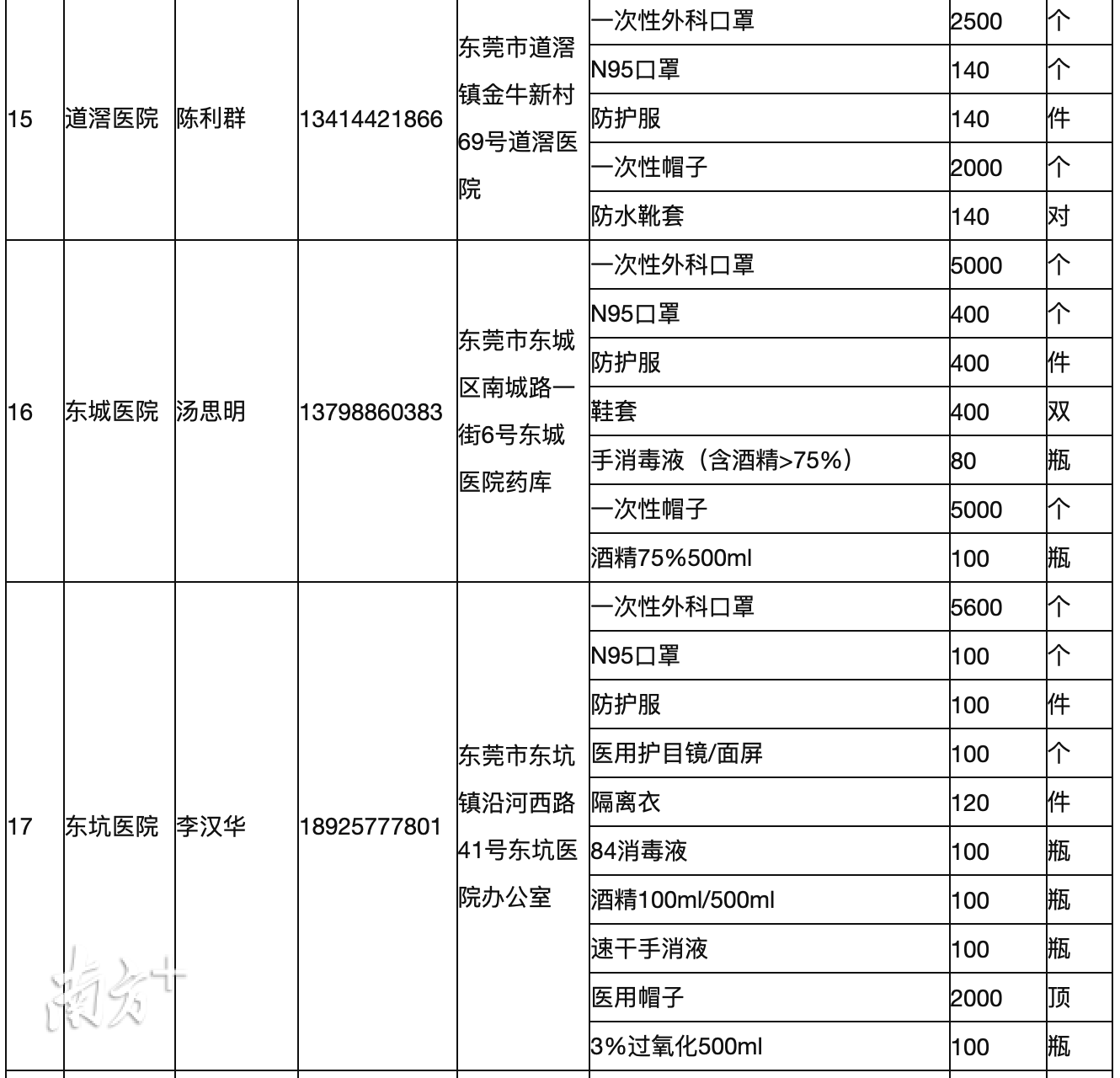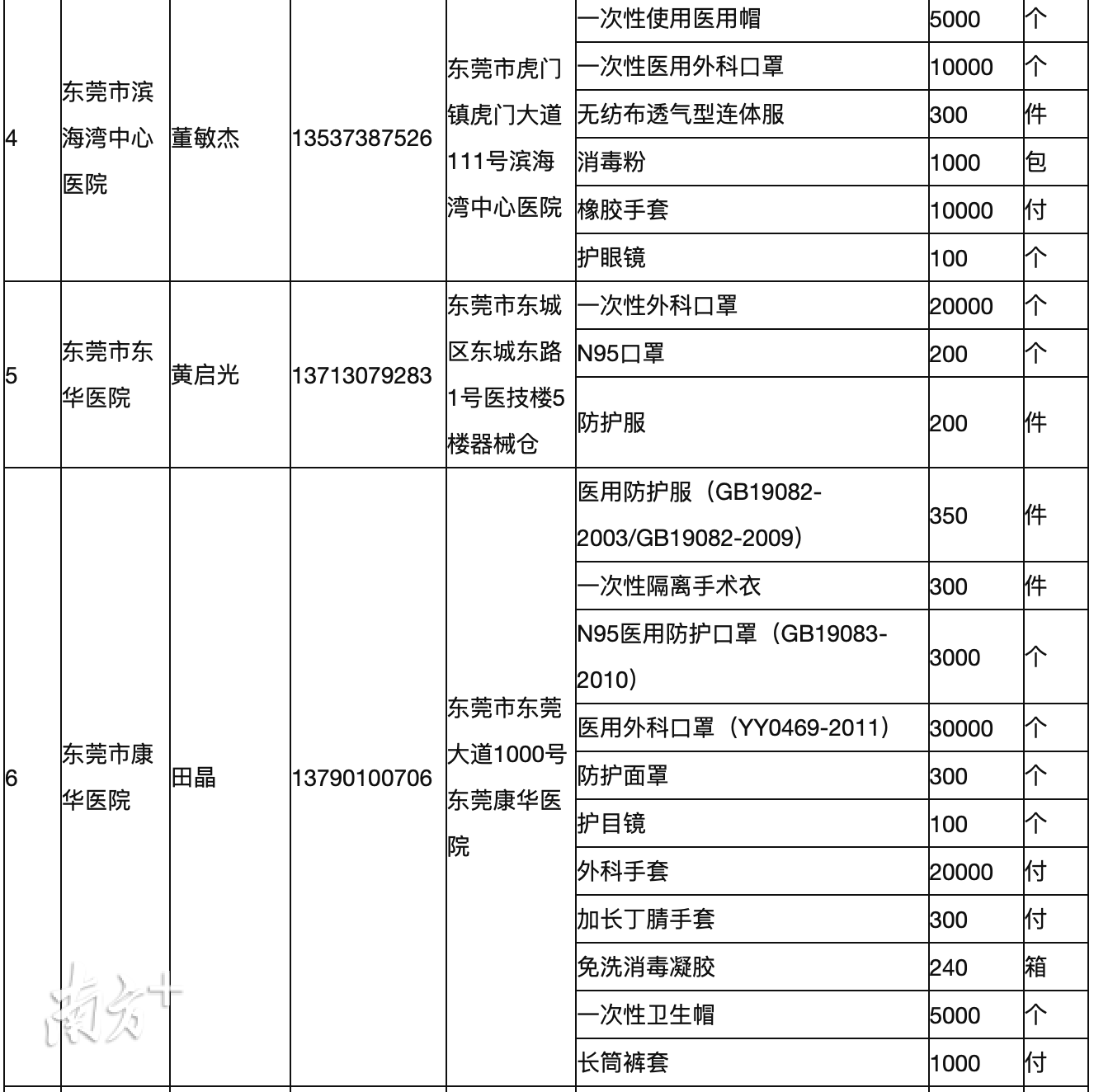 “东莞市人民医院需要医用外科口罩61600个、N95口罩17500个、一次性医用连体防护服3500件、一次性工作帽(无纺帽)30800个,东莞市第九人民医院需要一次性外科口罩5000只、N95口罩1000只、防护服7000件,……”随着疫情发展,东莞医疗物资紧缺,2月9日,东莞市红十字会公布了全市38家定点收治医院和发热门诊需求的物资,社会各界可通过直接联系医院或通过红十字会两种方式捐赠。