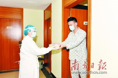杨枝艳将汤圆递给被隔离人员。南方日报记者 王云 摄