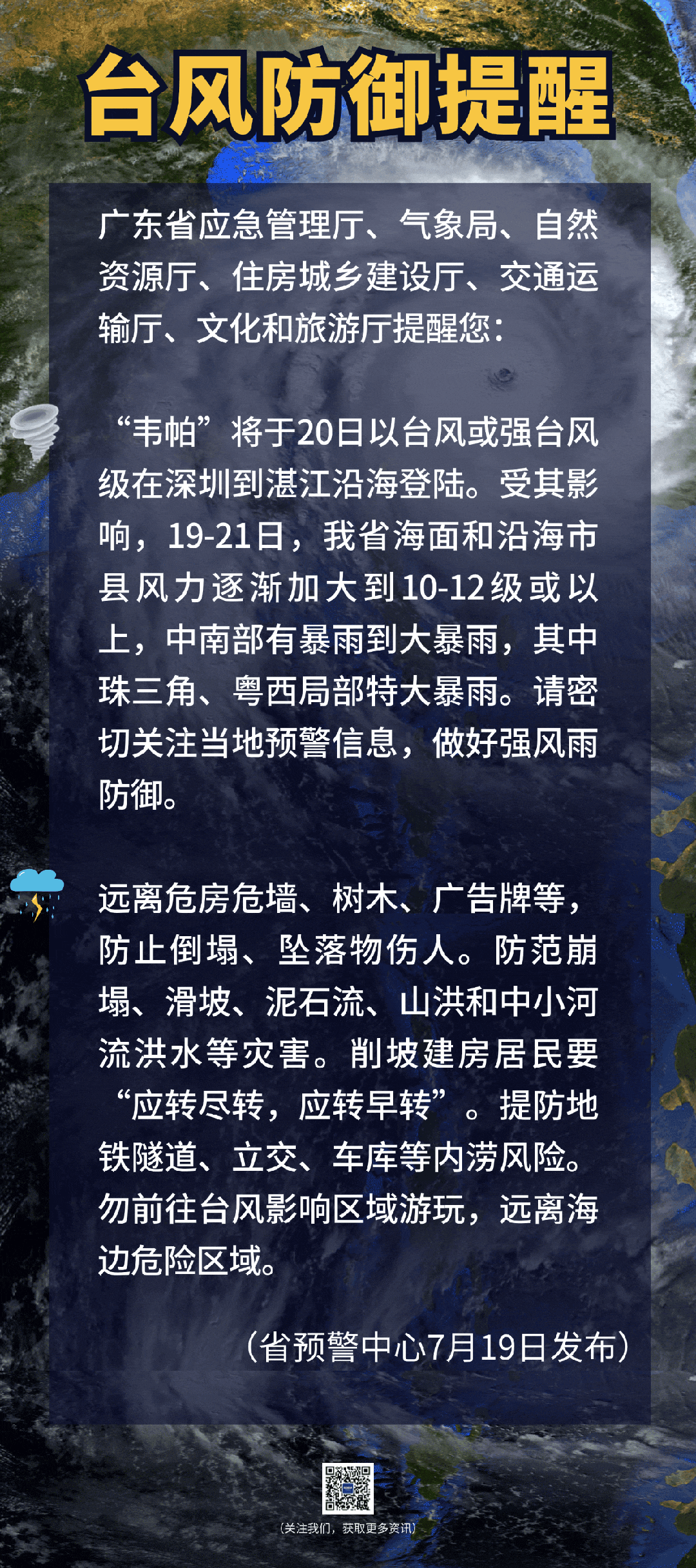鉴于今年第6号台风“韦帕”进一步加强,可能以台风级登陆我省,将给我省带来严重的风雨浪潮影响。根据《广东省防汛防旱防风防冻应急预案》和省防总有关规定,广东省防汛防旱防风总指挥部已于7月19日11时将防风Ⅳ级应急响应提升为防风Ⅱ级应急响应。