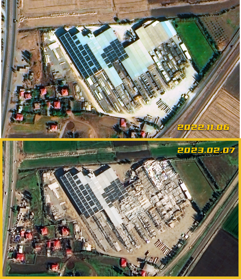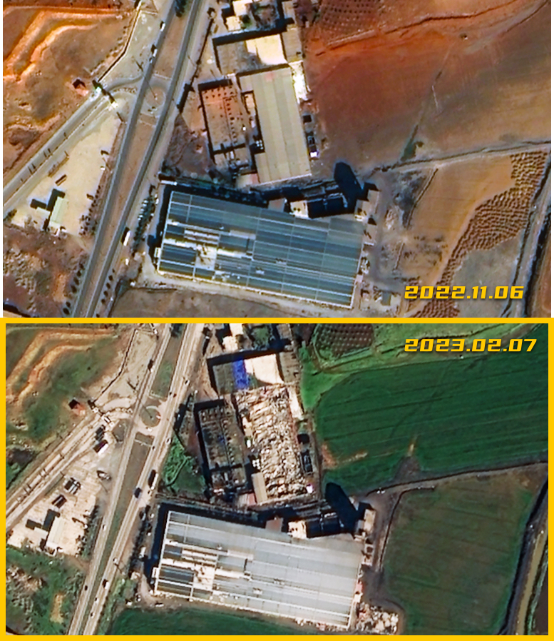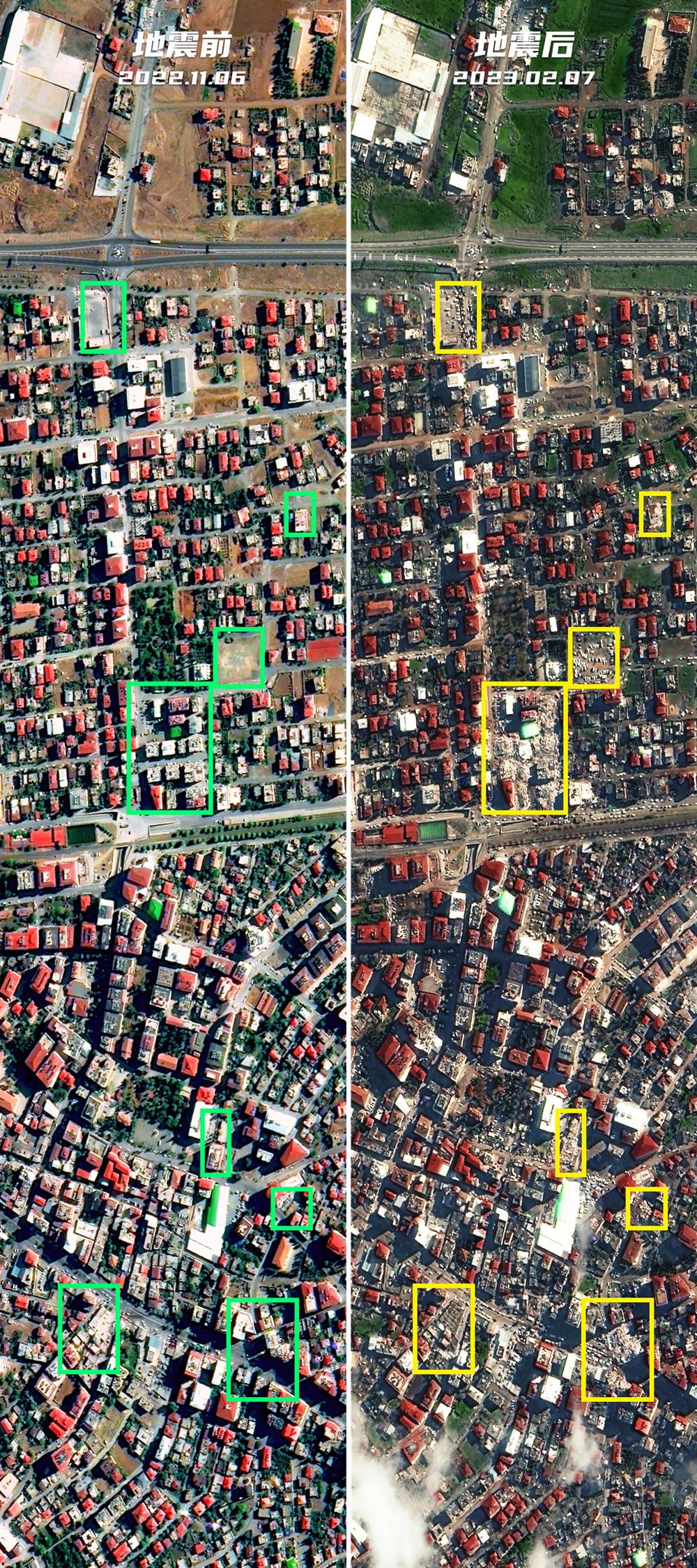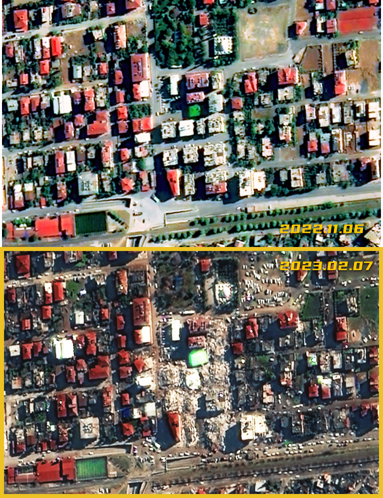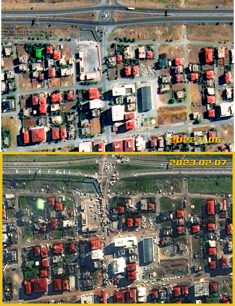 土耳其南部卡赫拉曼马拉什省也是地震重灾区,距离震中不远。从长光卫星提供的卫星影像中可以看到,该省蒂尔克奥卢地区多处建筑物几乎被夷为平地,留下一片废墟,由此可见现场救援难度之大。