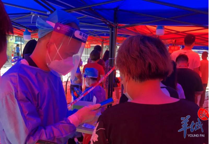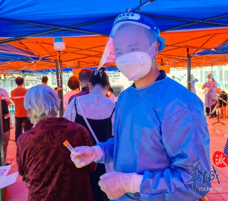同样身在管控区的越秀区公安分局民警张荣辉也主动作为,积极参与到社区志愿者服务中,与社区其他志愿者逐一上门登记排查,呼吁群众参与核酸检测。