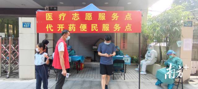 就在管控区请假证明开具点斜对面,今天社区还设立了医疗志愿服务点、代开药便民服务点。