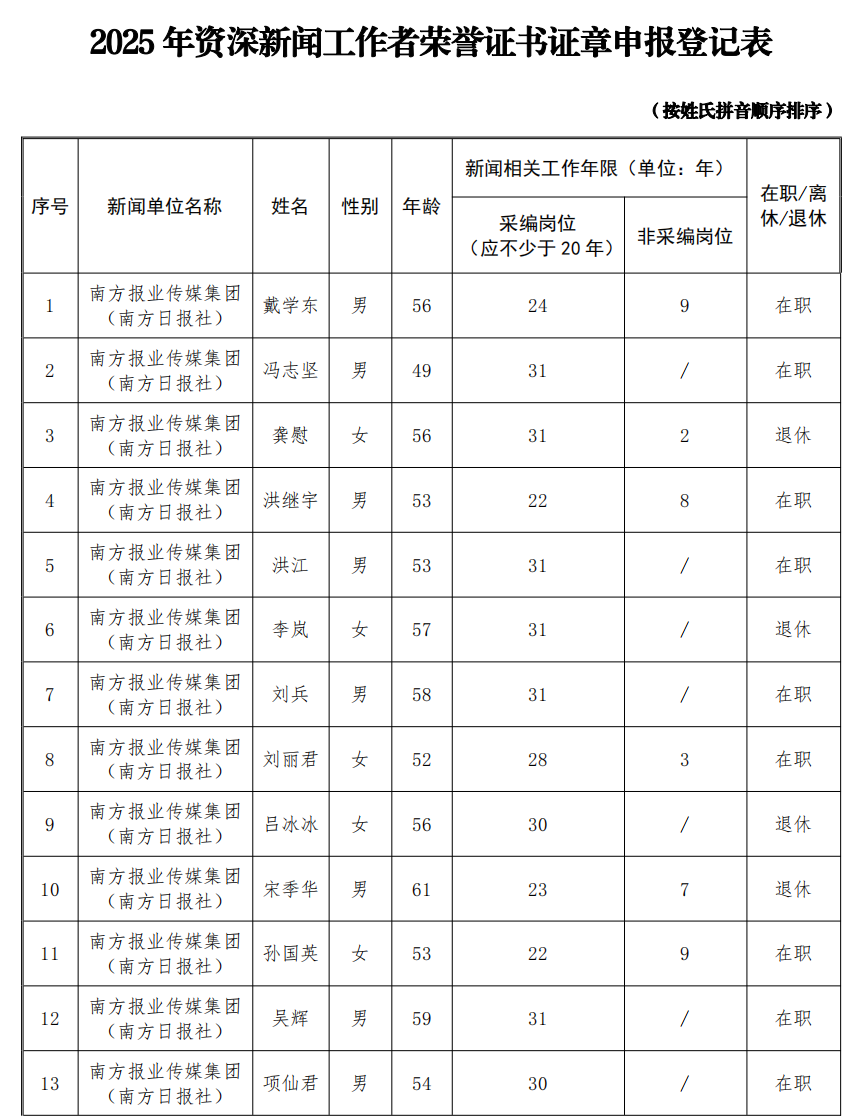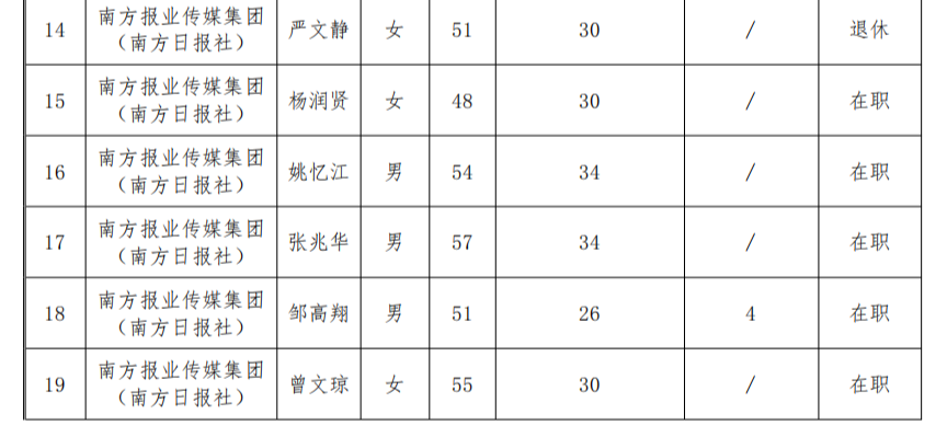 根据广东省新闻工作者协会《关于向资深新闻工作者颁发荣誉证书和证章的通知》要求,现将本单位符合申报条件的19位同志予以公示。