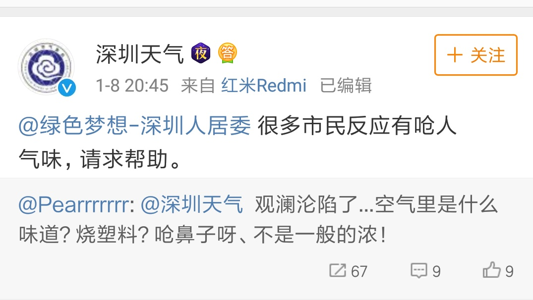 1月8日晚,深圳市龙华区、福田区等区多位市民在新浪微博上反映当地空气中有浓烈的烧塑料味道。网友@Pearrrrrrr 反映:“观澜沦陷了…空气里是什么味道?烧塑料?呛鼻子呀!不是一般的浓!”网友C小齿轮称:“今天空气好臭,好几个区都好臭,烧塑料味道。龙华龙岗宝安都是臭的。”