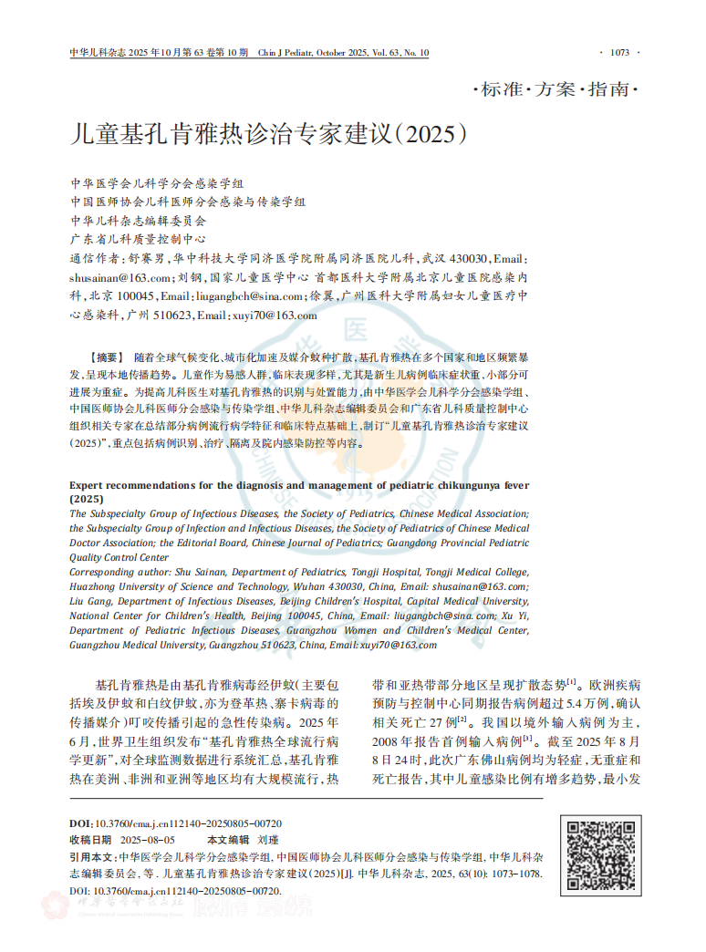 由中华医学会儿科学分会感染学组等单位联合制定的《儿童基孔肯雅热诊治专家建议(2025)》正式发表于《中华儿科杂志》。