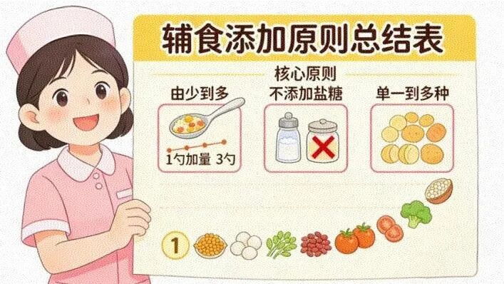 由少到多、由稀到稠、由细到粗、由一种到多种。这是辅食添加的核心原则,家长务必严格遵守。