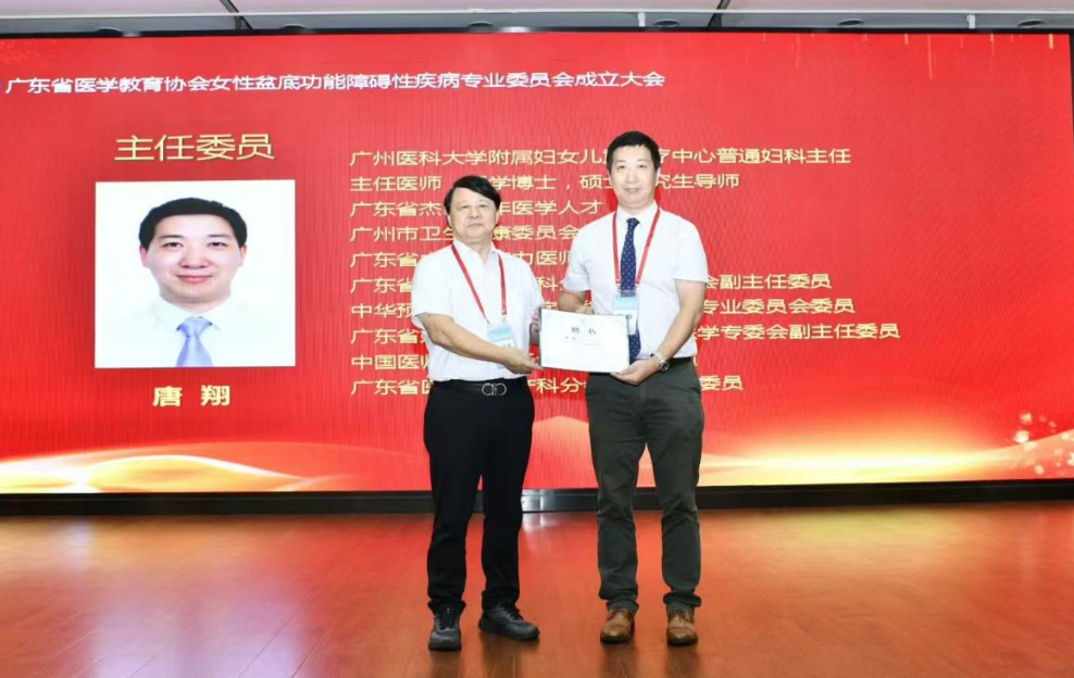 广州妇儿中心普通妇科唐翔主任当选主任委员。周增桓主席为主委单位广州妇儿中心颁授铭牌。