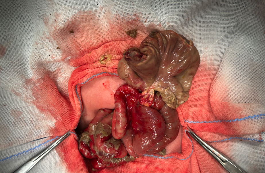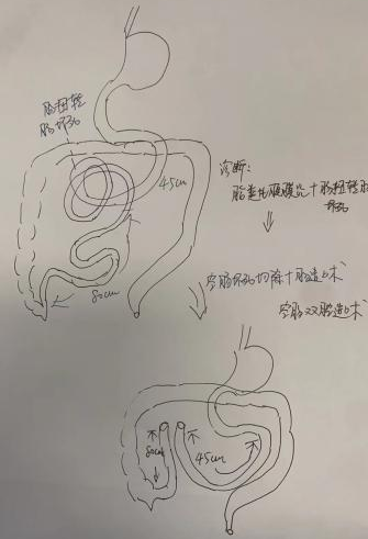 术中可见空肠扭转呈720°,肠管已呈灰白色,缺血坏死,确诊为“胎粪性腹膜炎、空肠扭转、肠坏死”,紧急行“坏死肠管切除+空肠双腔造口术”,术后顺利转入病房。