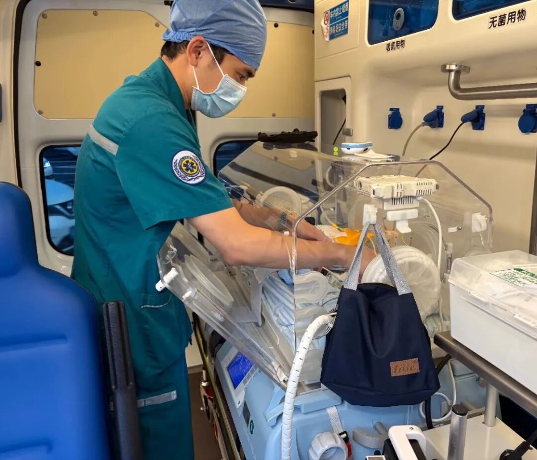 “保持血氧饱和度稳定!”“注意输液速度!”在鸣笛疾驰的救护车厢内,医疗团队在颠簸中建立了一个移动的“新生儿重症监护室”,陈医生负责密切监护患儿的生命体征,准备好随时应对突发情况;林文锴护士负责固定好患儿的气管导管、胃肠减压管、静脉输液通路等管路,两人各司其职,将患儿顺利送达医院。