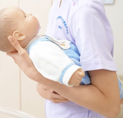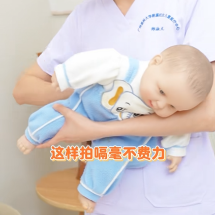 将宝宝的小手放在胸前侧身,一只托住宝宝头颈部,另一只手支撑臀部,前屈上身接住宝宝,让宝宝靠在你的肩部,宝宝的头偏向一侧,注意观察宝宝的面色,身体可以微微往后仰,让宝宝依靠在我们身上,这样拍嗝毫不费力啦。
