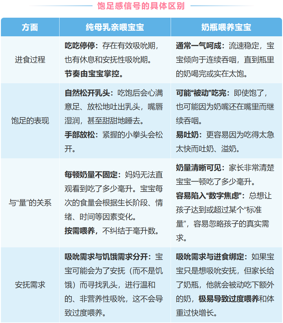 ►奶瓶喂养:宝宝的饱足感更依赖于看护人的判断,容易受到固定奶量和恒定流速的影响,需要家长格外留心放缓喂养节奏,观察宝宝的真实信号,以避免过度喂养。