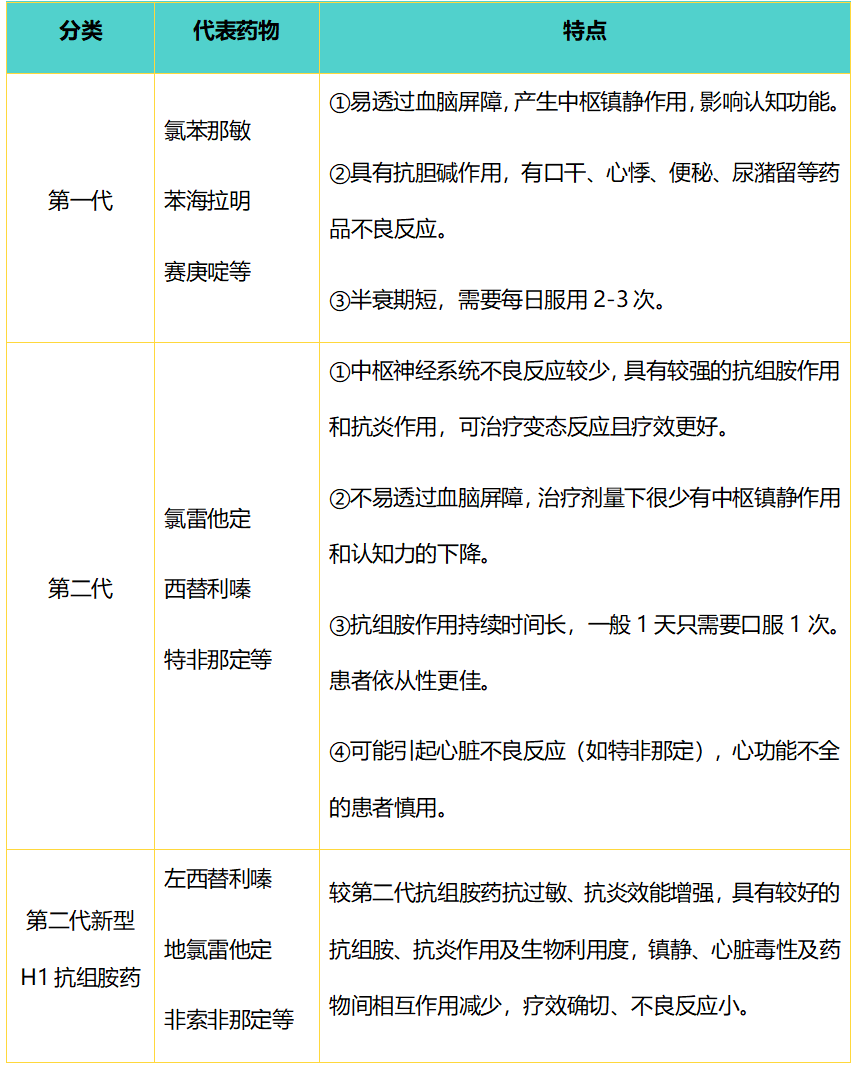 其中,组胺H1受体拮抗剂可以有效缓解组胺引起的皮肤瘙痒、红斑、风团以及鼻痒、流涕、喷嚏、眼痒、结膜充血等症状,是荨麻疹、过敏性鼻炎的一线治疗药物。