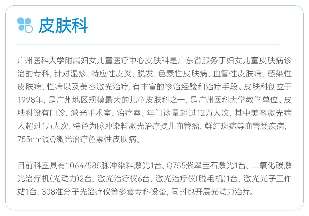 目前,广州妇儿中心皮肤科已开展化学换肤项目,更多注意事项可以面诊咨询皮肤科专业医生,医生将根据你的皮肤类型和需求,为你提供个性化的建议、治疗方案及术后护理。