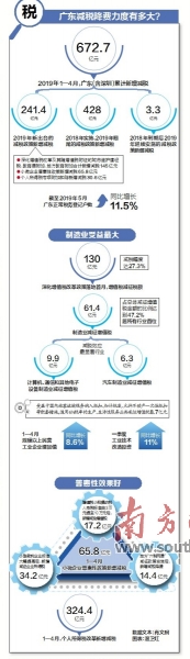 “此次减税降费,既有面向制造业精准减税的‘主菜’,又有聚焦小微企业群体的普惠性政策,还有惠及每一名自然人的个税改革,普惠面广、减税幅度大,给企业和个人都带来满满的获得感。”省税务局副局长陈忠明介绍,1—4月,广东小微企业普惠性政策新增减税65.8亿元。其中:增值税小规模纳税人免税标准由3万元提至10万元后,新增减免增值税17.2亿元;小型微利企业标准大幅提高后,新增减征企业所得税34.2亿元。