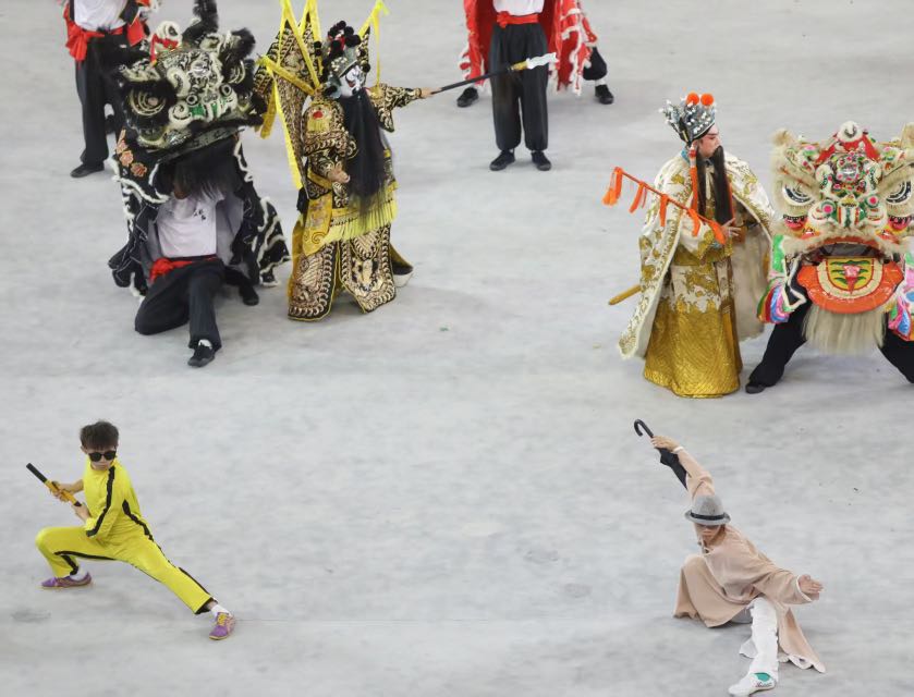 演出汇聚了佛山最闪亮的文化名片:15头威武的传统狮伴着八面狮鼓的激昂节奏奔腾而出;粤剧中经典的刘、关、张形象与黄飞鸿、叶问、李小龙等功夫传奇人物同台,刚柔并济;百米大金龙与气势恢宏的大旗队交织舞动,勾勒出一幅“龙腾盛世”的壮丽画卷。