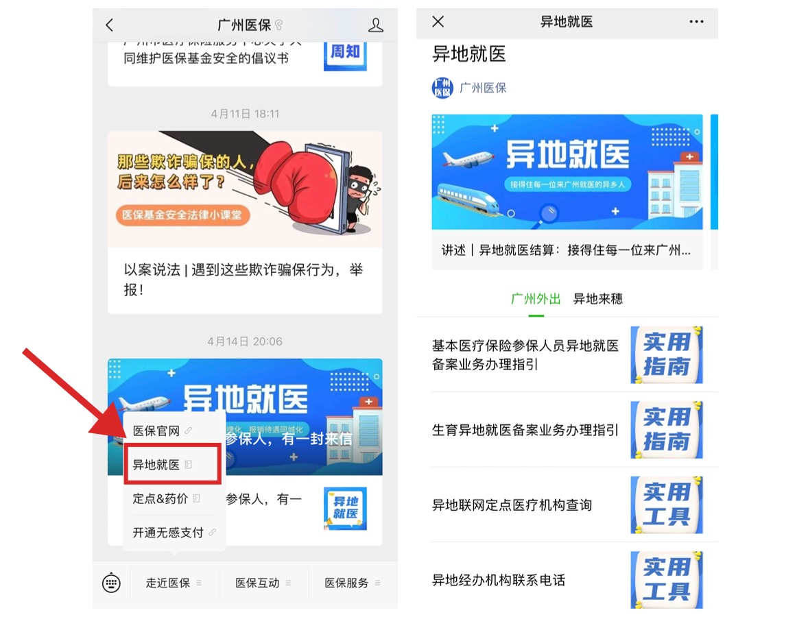 方法一:“广州医保”微信公众号在主页下方菜单栏“走近医保”增设了“异地就医”栏目。点击进入即可查看异地就医备案相关内容。