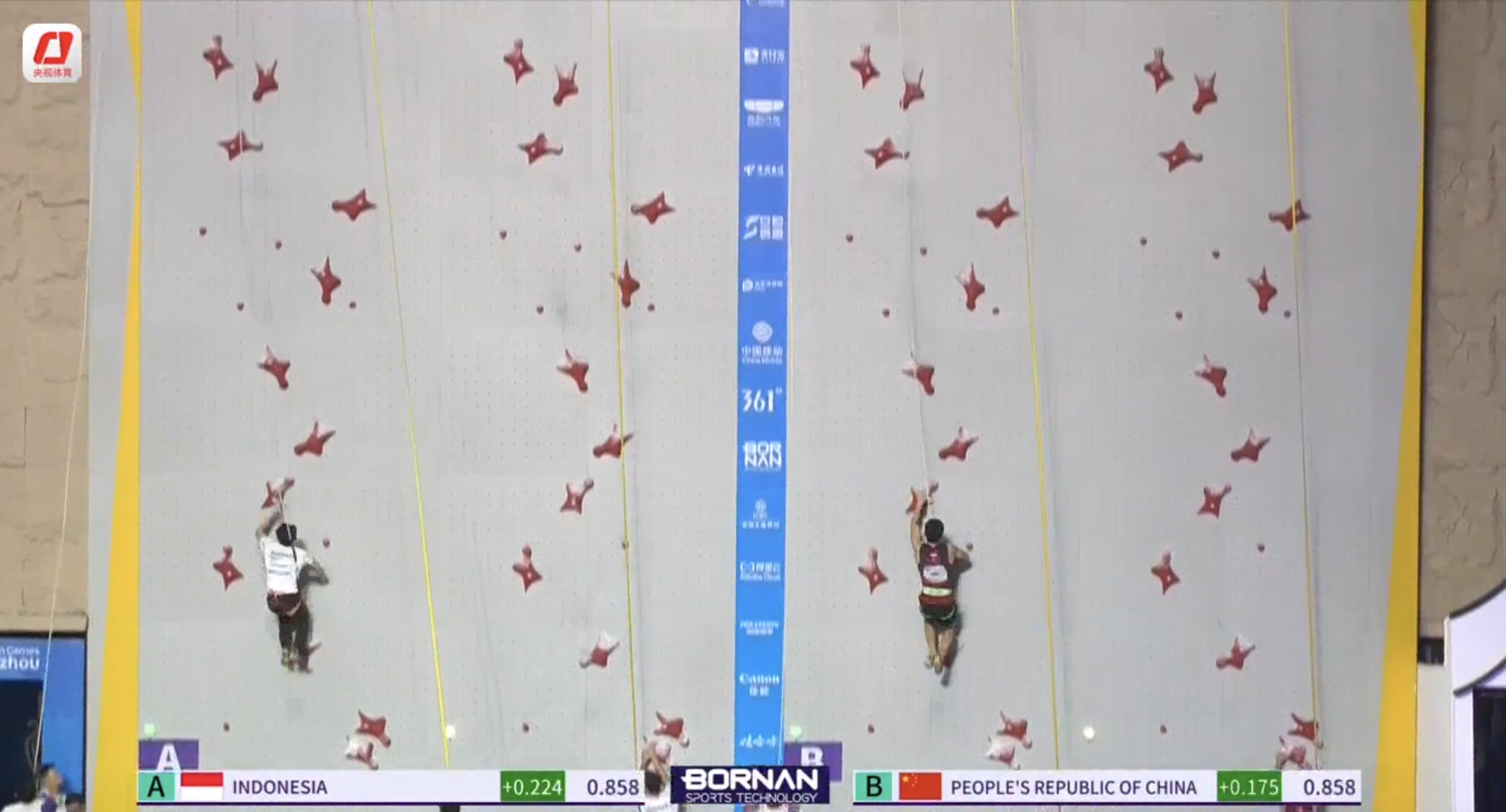 10月4日,杭州第19届亚运会攀岩男子团体速度接力决赛,中国队战胜印尼队夺得金牌。