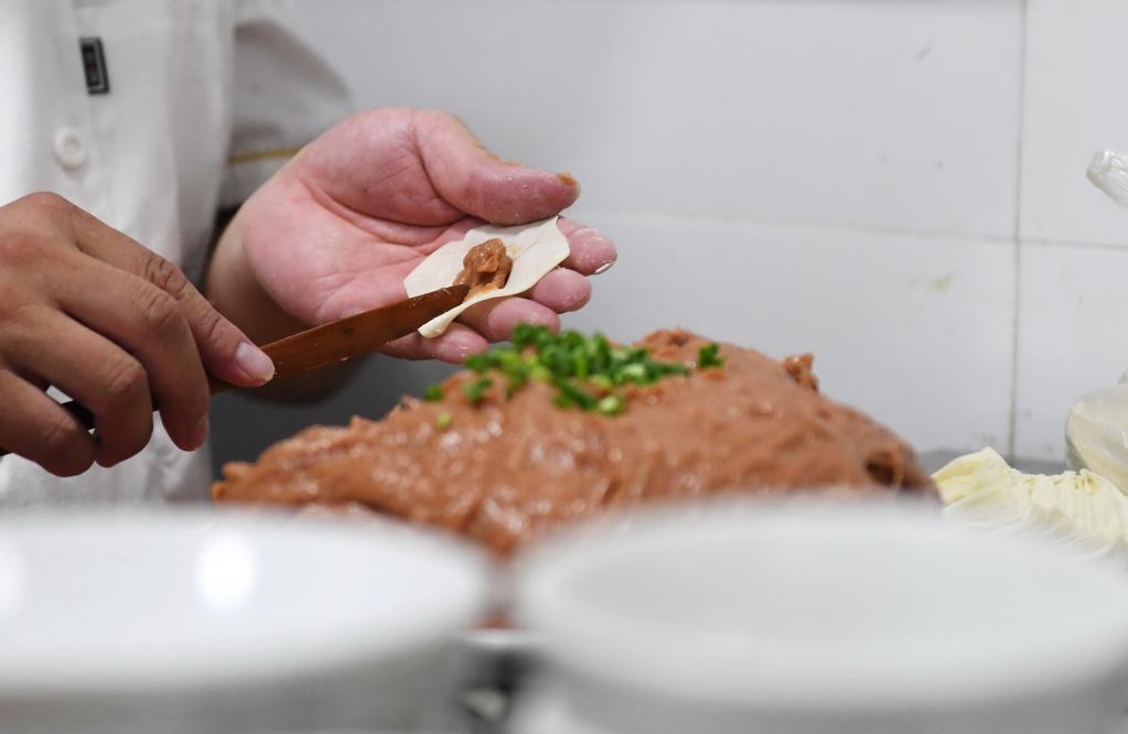 2021年6月11日,在三明市沙县区,沙县庙门扁肉传承人王盛滨在包制沙县扁肉。新华社记者林善传摄