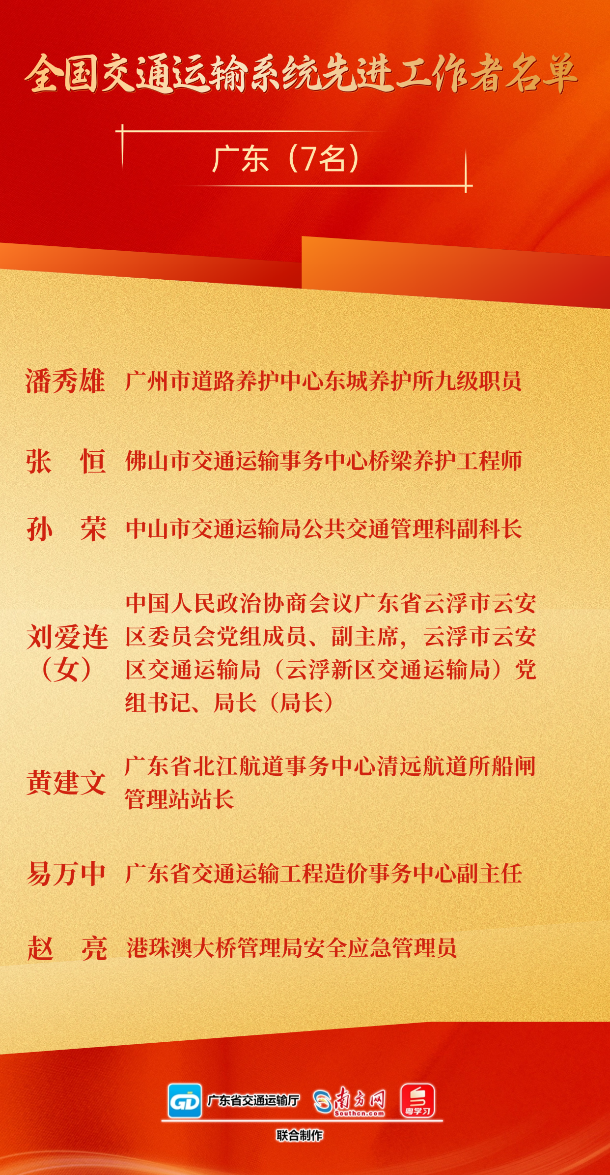 近年来,我省交通运输系统广大干部职工坚持以习近平新时代中国特色社会主义思想为指导,全面贯彻习近平总书记关于交通强国的重要论述,积极投身交通运输事业,扎实践行社会主义核心价值观,传承弘扬交通精神,涌现出一批先进典型。我们要以受表彰的先进集体和个人为榜样,锚定加快建设交通强国的战略目标,立足岗位、开拓创新,坚定信心、奋发有为,为广东在推进中国式现代化建设中走在前列充分发挥交通开路先锋作用。