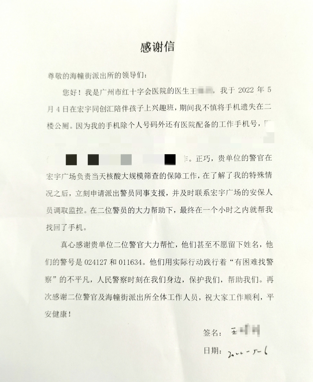 “人民警察时刻在身边保护我们,真心感谢两位警官的大力帮助。”近日,市民王女士到海珠区公安分局海幢派出所送上感谢信,为民警快速帮其找回手机表达衷心地感谢。