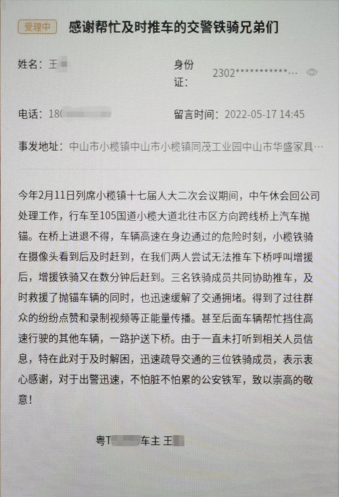 近日,“平安厅”中山公安局长信箱收到一封群众王某专门写给小榄公安分局交警铁骑队的感谢信。