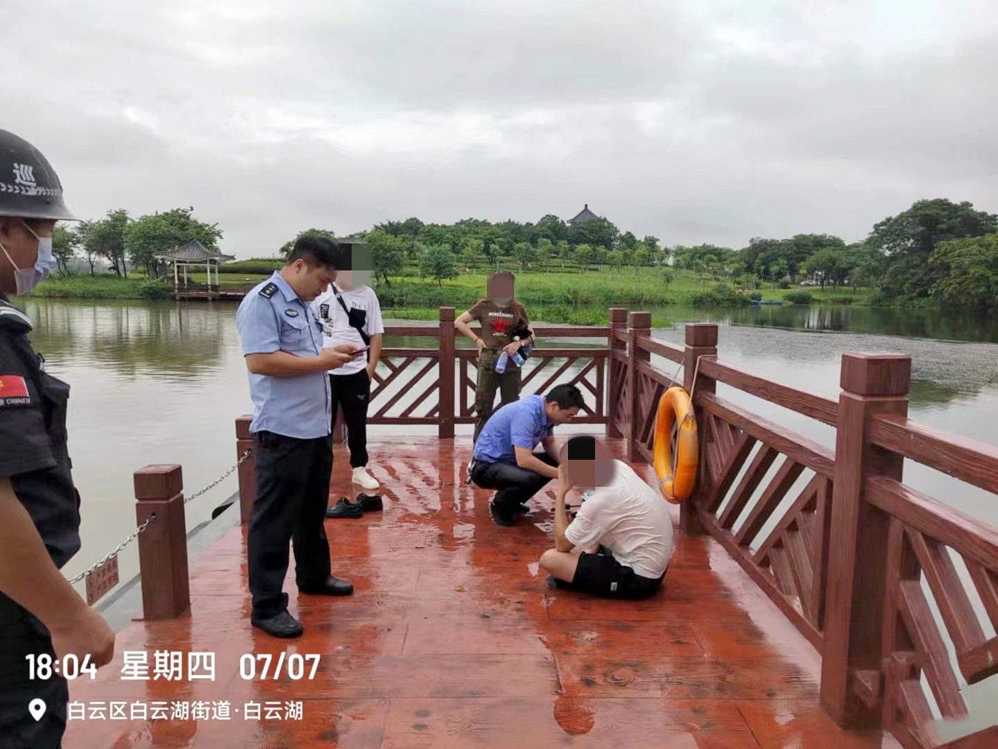 许育林和李满铿生怕男子再次轻生,将男子安置在栈桥远离湖边的另一侧。许育林安慰道:“没事了,兄弟,你先缓一缓,有什么事之后再好好说。”