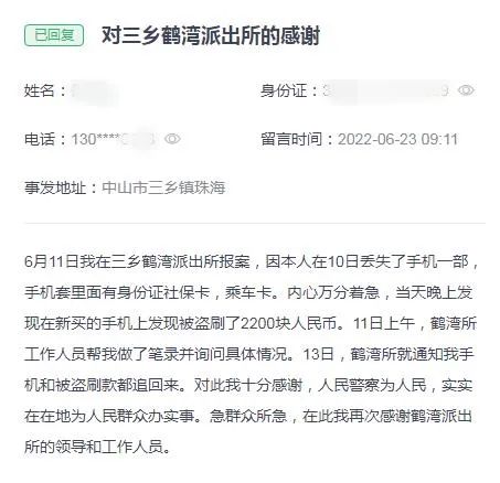 6月23日,市民何先生对鹤湾派出所快速破案为其追回财物,挽回个人损失表示衷心感谢。