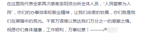 民警的暖心话语,贴心举动,让遭遇丧父之痛的张女士三兄妹感到非常温暖。为此,张老伯的儿媳卢女士事后特地在“平安厅”梅州公安局长信箱写信表达感谢之情,“民警一直耐心替我们处理各项事情……我代表全家感谢茶阳派出所全体工作人员,人民警察为人民,你们是我们在黑暗中的亮光。”