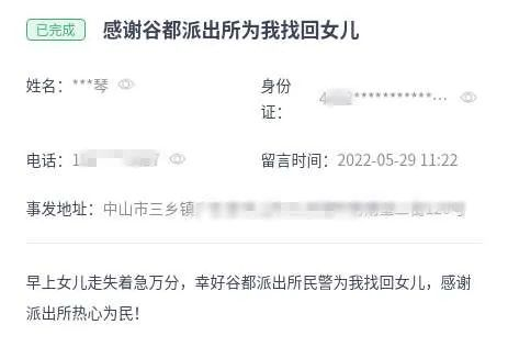 “早上女儿走失着急万分,幸好谷都派出所民警为我找回女儿,感谢派出所热心为民!”