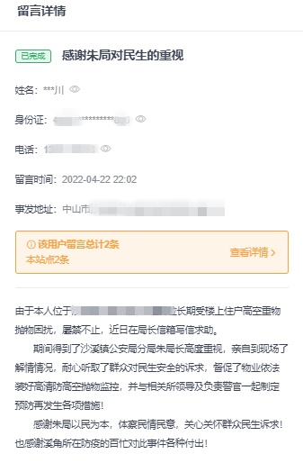 居民黄先生是中山市沙溪镇某小区楼下商铺的商户,于今年4月份,小区高空坠物的问题让黄先生深受困扰,其曾向小区物业及相关部门反映问题,但效果甚微。沙溪居民黄先生因担心高空坠物再次发生,便通过“平安厅”中山公安局长信箱反映了小区高空抛物的情况。