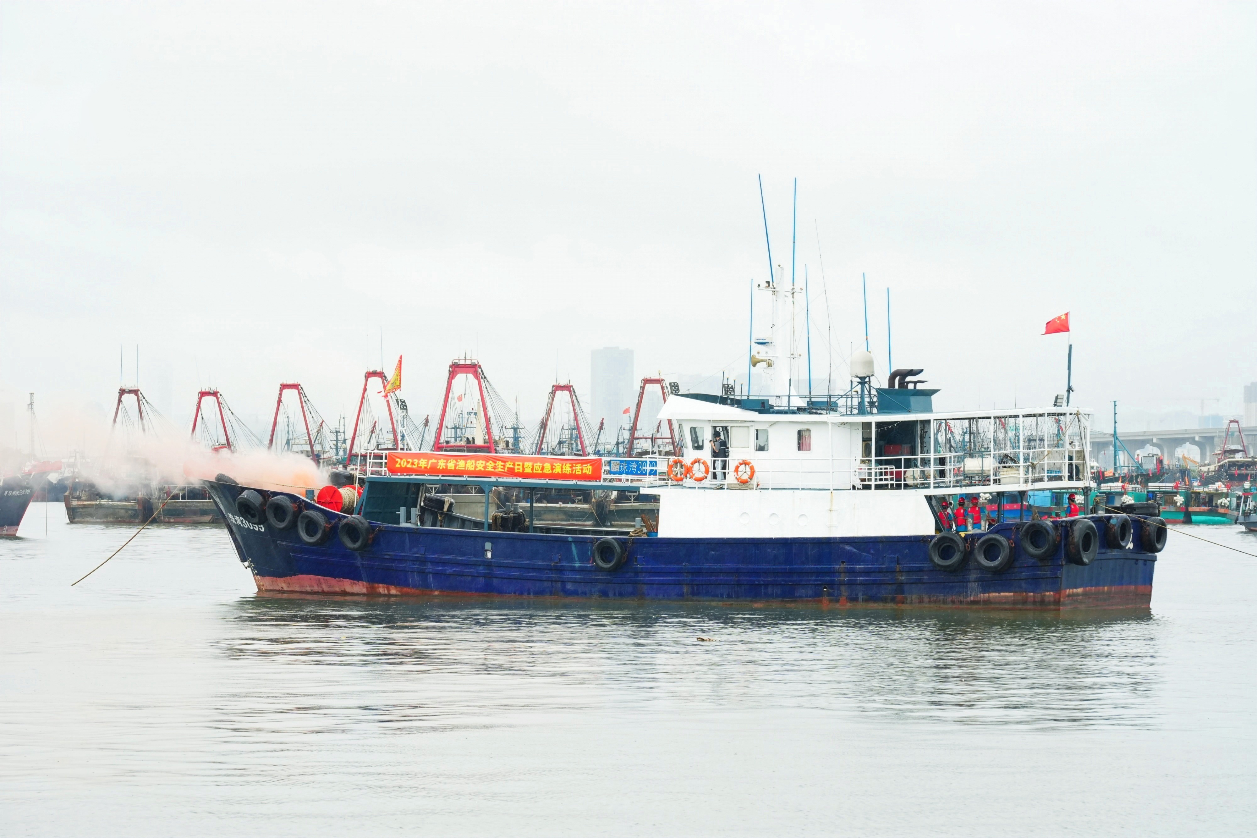 南方网讯(记者/张维聪 通讯员/粤海综)为保障渔民生命财产安全,以高水平安全促进高质量发展,根据国务院安委会、农业农村部和省委、省政府“安全生产月”活动部署,6月16日,广东省海洋综合执法总队(下称“总队”)在珠海市洪湾中心渔港组织举办2023年广东省渔船安全生产宣传日暨应急演练活动。总队党组成员、副总队长吴卓龙同志,全省14个沿海支队负责人及相关同志,船舶安全装备参展企业及渔民代表共300余人参加。