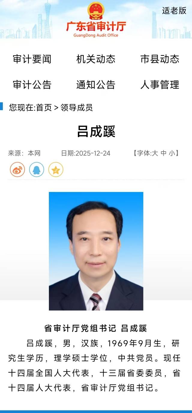 广东省审计厅官网信息显示,吕成蹊已任广东省审计厅党组书记。