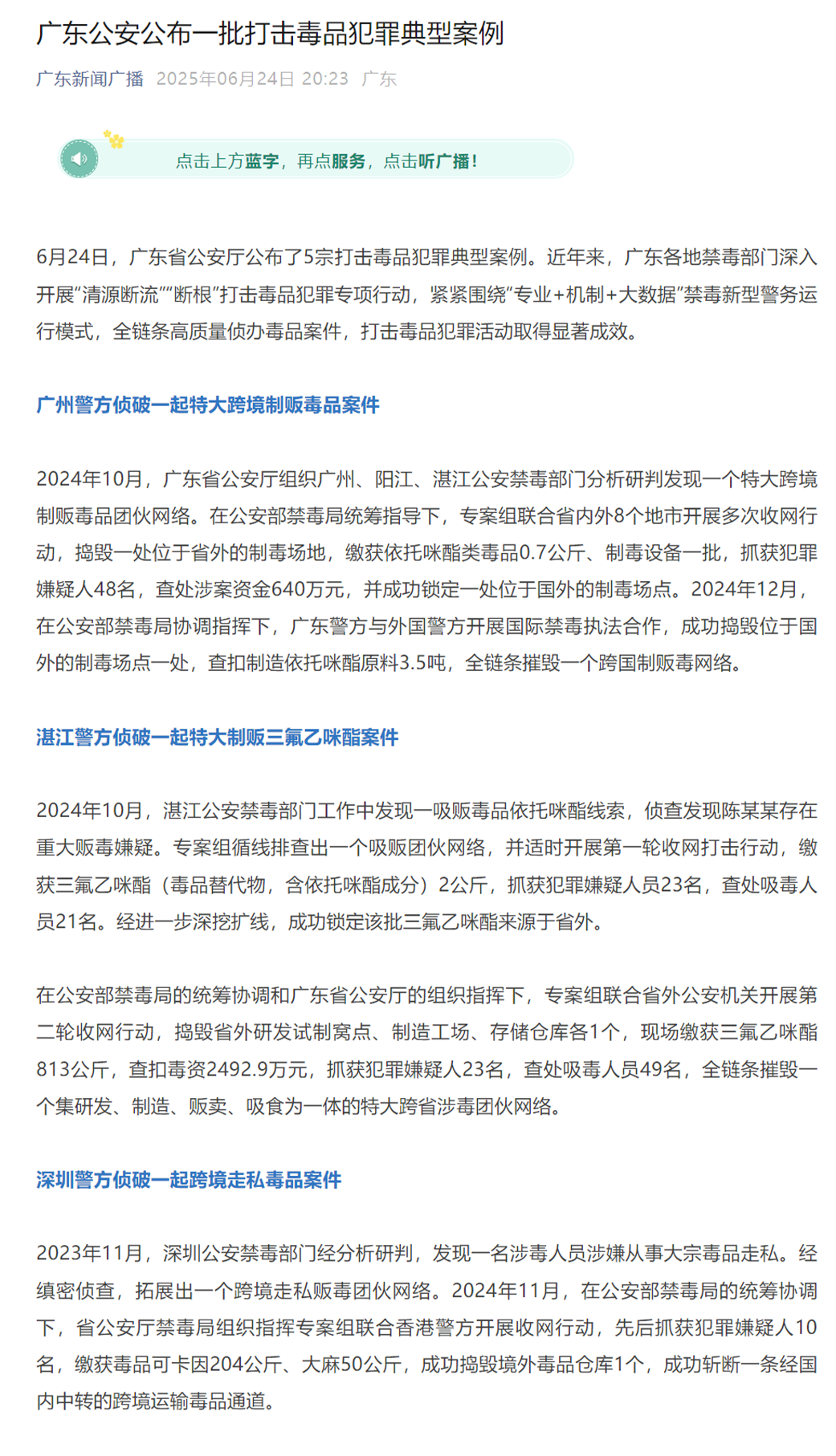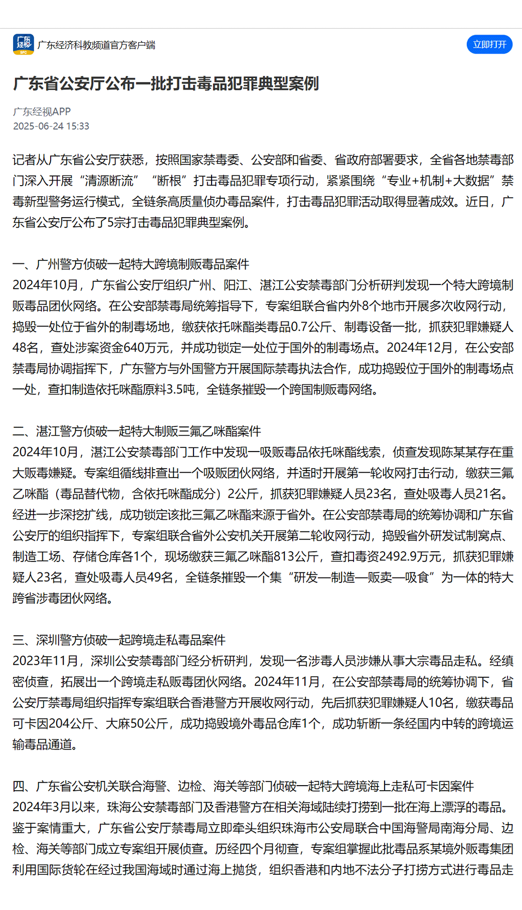 按照国家禁毒委、公安部和省委、省政府部署要求,全省各地禁毒部门深入开展“清源断流”“断根”打击毒品犯罪专项行动,紧紧围绕“专业+机制+大数据”禁毒新型警务运行模式,全链条高质量侦办毒品案件,打击毒品犯罪活动取得显著成效。今年6月,广东省公安厅公布了5宗打击毒品犯罪典型案例。