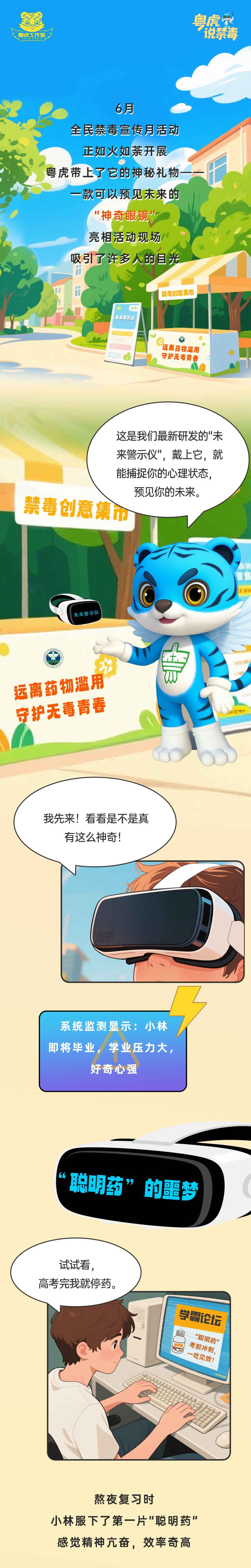 近年来,涉麻精药品等成瘾性物质的滥用问题日益严重,尤其对正处于身心成长关键期的青少年群体构成了巨大威胁。在第38个“6·26”国际禁毒日来临之际,广东禁毒特别推出“防范青少年药物滥用”系列策划,深度普及禁毒知识,增强全民识毒、防毒、拒毒意识,护航青少年健康成长。本期,戴上一副可以预见未来的“神奇眼镜”,沉浸式感受滥用、随意买卖麻精药品等成瘾性物质带来的危害,和粤虎一起改写结局,重新找回他们的无毒青春。