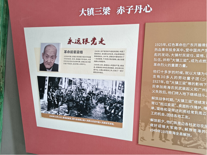 1925年,红色革命在岭南开展得如火如荼,大量热血青年投身其中。受中国共产党人赵钊、杜国彪的发动,大镇村民梁仕、梁格、梁荣加入革命队伍,并称“大镇三梁”,成为点燃大沥乃至南海革命烈火的重要力量。