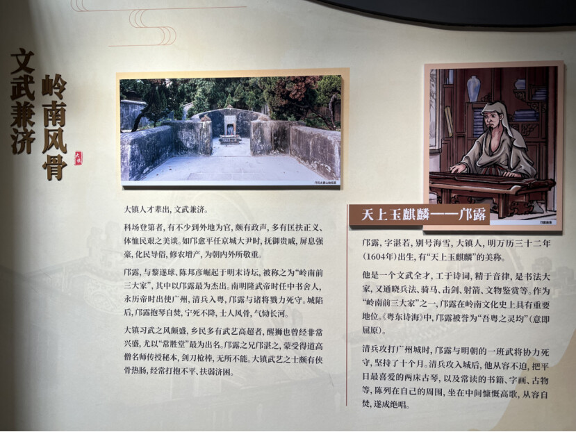 邝露,字湛若,别号海雪,南海大沥乡大镇村人,明万历三十二年(1604年)出生,有“天上玉麒麟”的美称。他是一个文武全才,工于诗词,精于音律,是书法大家,又通晓兵法、骑马、击剑、射箭、文物鉴赏等。作为“岭南前三大家”之一,邝露在岭南文化史上具有重要地位。《粤东诗海》中,邝露被誉为“吾粤之灵均”(意即屈原)。