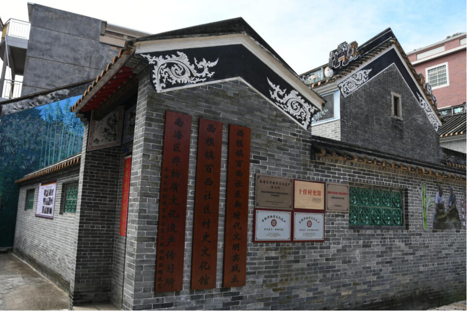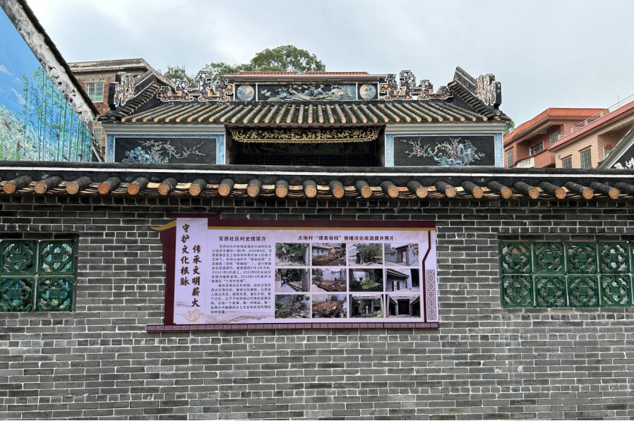 百西社区村史馆坐落在南海西樵百西大地村松岗公园旁圣塘坊一巷2号,2020年9月百西居委会利用大地村中“理斋祖祠”古老建筑(俗称“雨帽组”),投入150万元进行修缮活化改造提升而成,建筑面积378.3平方米,于2021年3月竣工,2022年8月完成村史馆内展陈装饰,2023年12月被评为南海区“十佳村史馆”。今成为百西社区非物质文化遗产传承和历史文化教育基地,也成为新时代文明实践点,为“和善百西”开展更多志愿服务。