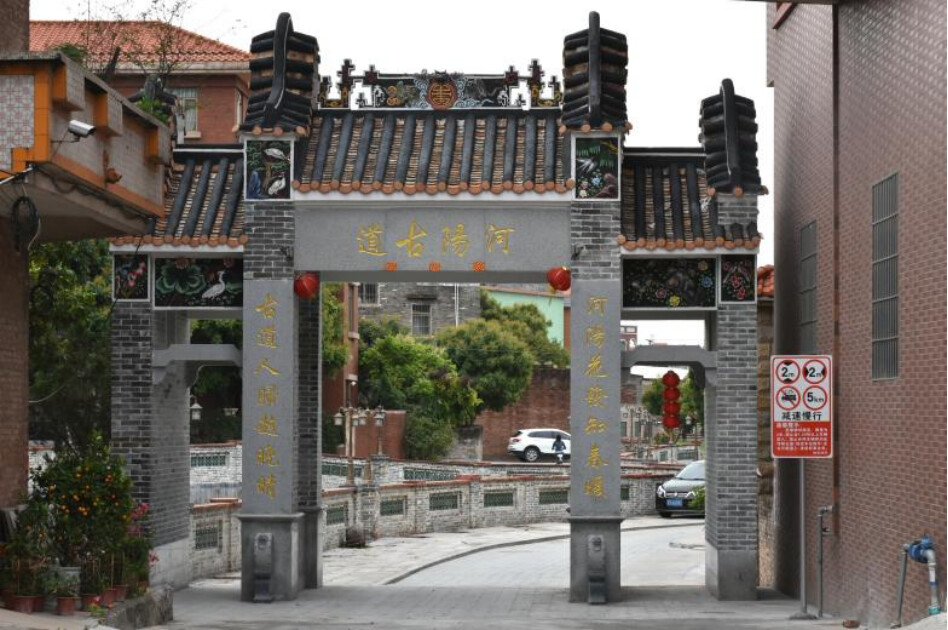 村头村“河阳古道”,是指一条由村西北潘氏大宗祠西侧一直通到村中六祖岗下的一条石板小路。清代举人潘文澧所撰对联“河阳花发知春暖,古道人归趁晚晴”就是指这条古道。修建古道的初衷,既是纪念潘氏的一位远祖、曾担任河阳县令的著名文豪潘岳,也是纪念村头村潘氏的祖先,七百年前从这条古道走进村头村,并一直繁衍生息至今成为南粤望族。