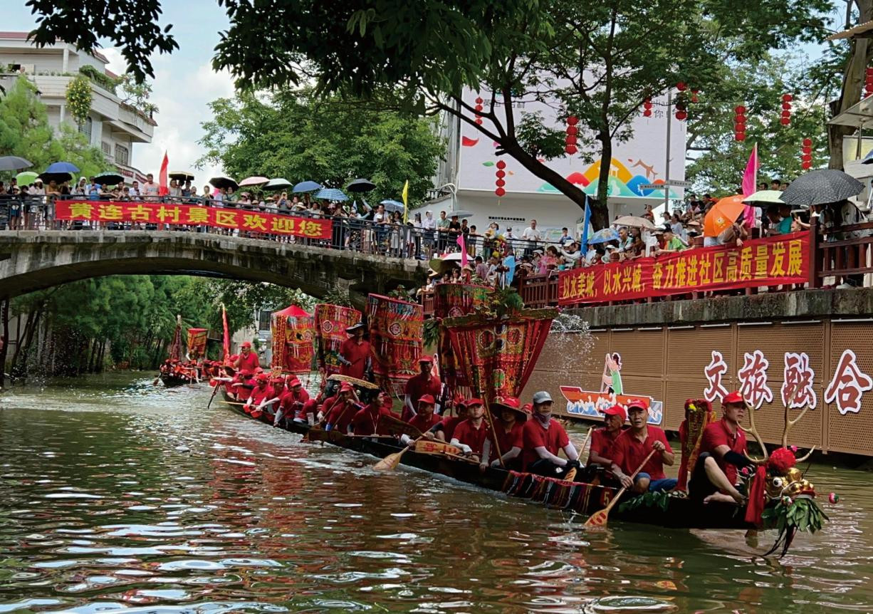 “棹影斡波飞万剑;鼓声劈浪鸣千雷”,端午佳节的黄连,游龙最为隆重。来自黄连各自然村、顺德及附近地区的数十艘龙船,齐聚黄连,竞艳、祈福。这种被称为“趁景”或“出游”的游龙,不在乎名次,注重表演技巧,比的是华美装饰、鼓乐整齐和纪律性等。