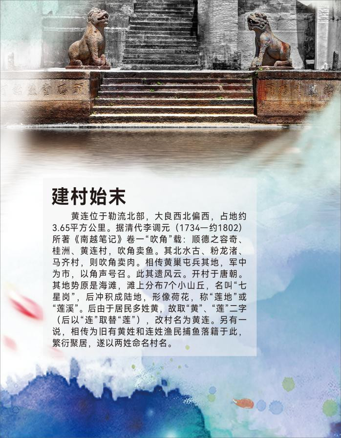 清初屈大均《广东新语·事语》载,“容奇、桂洲、黄连村吹角卖鱼”。清咸丰《顺德县志》载,黄连一村,是黄连堡人烟最稠密之处,且商贾、市集“久而益旺”,“族多衣冠,为商贾舟楫之凑”。