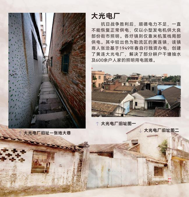 抗日战争胜利后,大良光中电力公司因原日股东星散,一直不能恢复正常供电,仅以小型发电机供大良部分街市照明。各圩镇则依靠米机茧栈局部供电。其中较出色为勒流区的黄连镇,该镇商人张洽基于1949年春自行独资办电,创建了大光电厂,解决了部分大耕户干塘抽水及600余人家的照明用电。